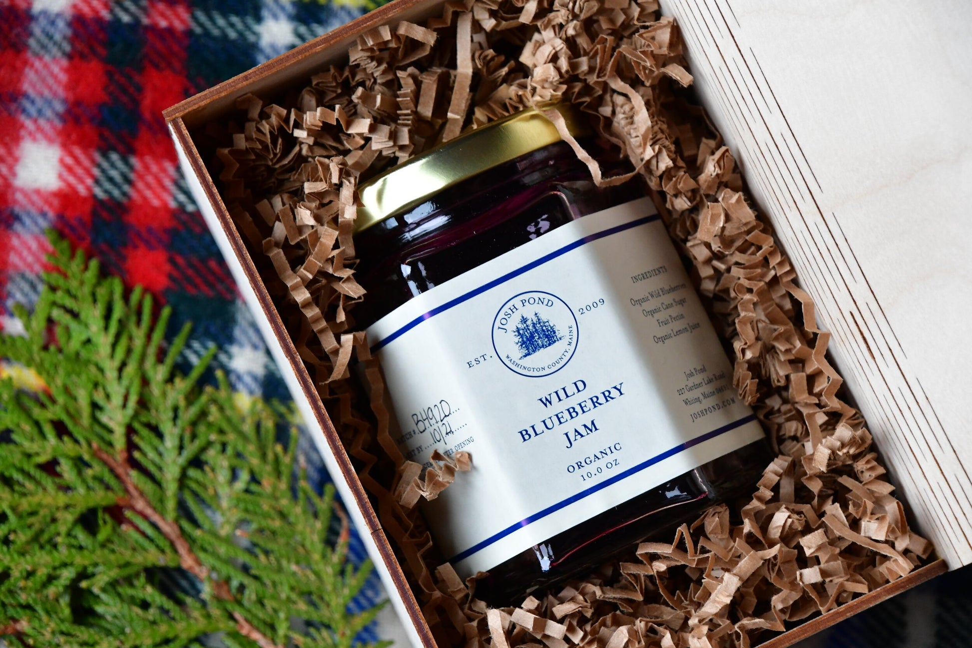 10oz. of Josh Pond's organic, wild blueberry jam, packed in our special pine box.