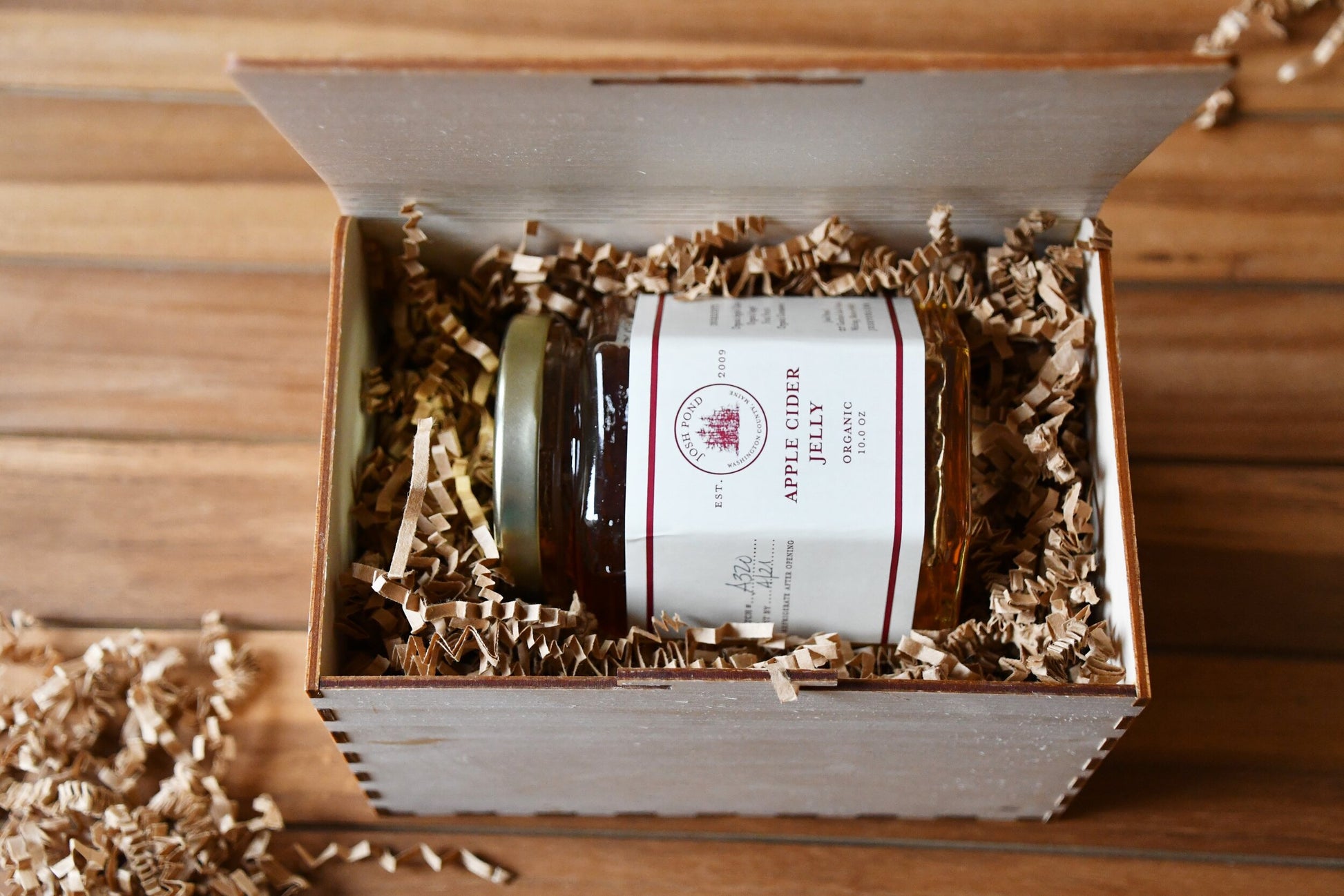 10oz. of Josh Pond's organic, apple cider jelly, packed in our special pine box.